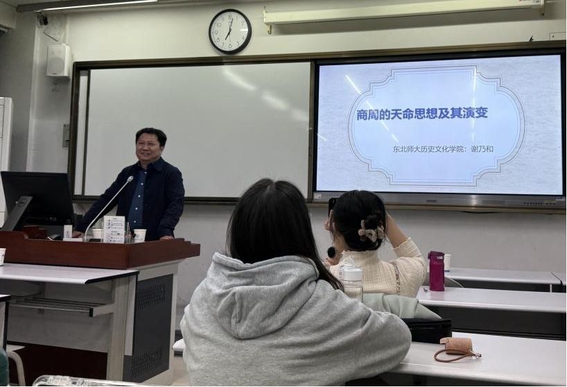 下午,由东北师范大学历史文化学院谢乃和教授主讲“商周的天命思想”讲座在通博楼108举行。谢教授深入分析了商周时期天命观的演变过程及其对中国古代国家治理的深远影响。讲座内容涵盖了商代“帝”与西周“皇天上帝”观念的发展,探讨了天命观念如何从自然宗教向政治宗教转化,并逐渐成为王朝更迭与权力合法性的重要理论依据,激发了学生对先秦思想的浓厚兴趣 。