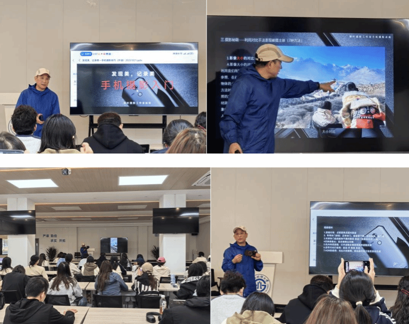 讲授内容十分丰富,涵盖五大板块:其一为手机摄影硬件设置及功能操作演示,帮助大家熟练掌握手机摄影“工具包”;其二是营造空间感的10种方法,助力拍摄出层次饱满的画面;其三是利用对比手法表现被摄主体的7种技巧,让画面主体更具表现力;其四是公务摄影的15个要点,满足校园工作中的摄影实务需求;其五是摄影后期修饰处理演示,教大家为作品进行“点睛”式优化。从硬件操作到后期处理,从创作思路到实务技巧,全方位助力同学们提升手机摄影水平。