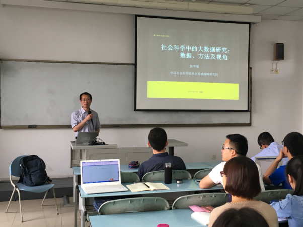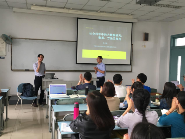 陈家建副教授主持,吸引了众多社会科学学科的老师、学生前来聆听。21世纪是大数据的时代,社会科学的研究也越来越多的使用大数据来进行研究分析。陈华珊老师结合自身多年大数据的研究经验,从大数据研究的“数据”、“方法”和“视角”三个方面来向大家介绍:社会科学研究如何采用大数据并结合新的量化分析手段。在“数据”方面,陈老师主要讲了三种大数据的利用形式、大数据的来源、与其他数据相比较的优劣势、对学术研究的新贡献以及数据如何测量等问题。在方法上,主要是以一个社区业主的论坛网站为案例研究,建立变量之间两两相关连的模型,比如词向量模型来研究。在研究视角层面,主要是从社会空间、动态的视角、机制解释取向来说明。鉴于大数据研究多是用信息技术手段来分析研究的,需要一定的专业技术,同时又非常新潮和有趣,所以在讲座最后的提问阶段,有很多老师和同学向陈老师提问。陈老师也非常耐心的解答大家的困惑,并同时鼓励大家:看似这项研究需要很强的专业技术性,但其实我也是社会学出身,依然可以做,只要大家了解了基本分析的原理,就可以做这样的研究.