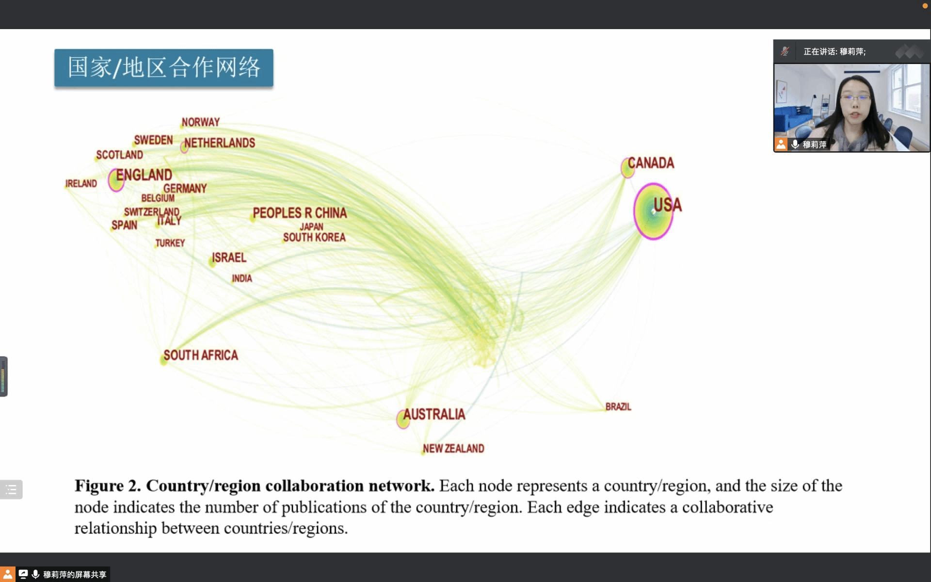 博士生穆莉萍为师生们作了主题为“青少年抗逆力”和“服务学习”的学术论文报告。汇报伊始,穆同学首先为大家介绍了题为《青少年抗逆力研究的趋势及热点》的文献计量类论文。论文使用可视化软件CiteSpace提取文献中的关键信息,分析青少年抗逆力研究的研究生产主体、知识结构、研究热点等科学特征,最后以知识图谱的形式直观地呈现出来,揭示了青少年抗逆力研究的网络结构和研究热点及未来研究方向。随后,基于服务学习的社会实践基础,穆同学汇报了题为《Service Leadership through Serving Minority Adolescents in Rural China Using a Rural Version of a Positive Youth Development Program》的研究,论文基于青少年积极发展的视角,讨论了服务领导力学习对服务少数民族青少年积极发展的影响研究,研究发现服务领导力学习课程对于服务接受者和服务实施者都有较为显著的正向积极影响。