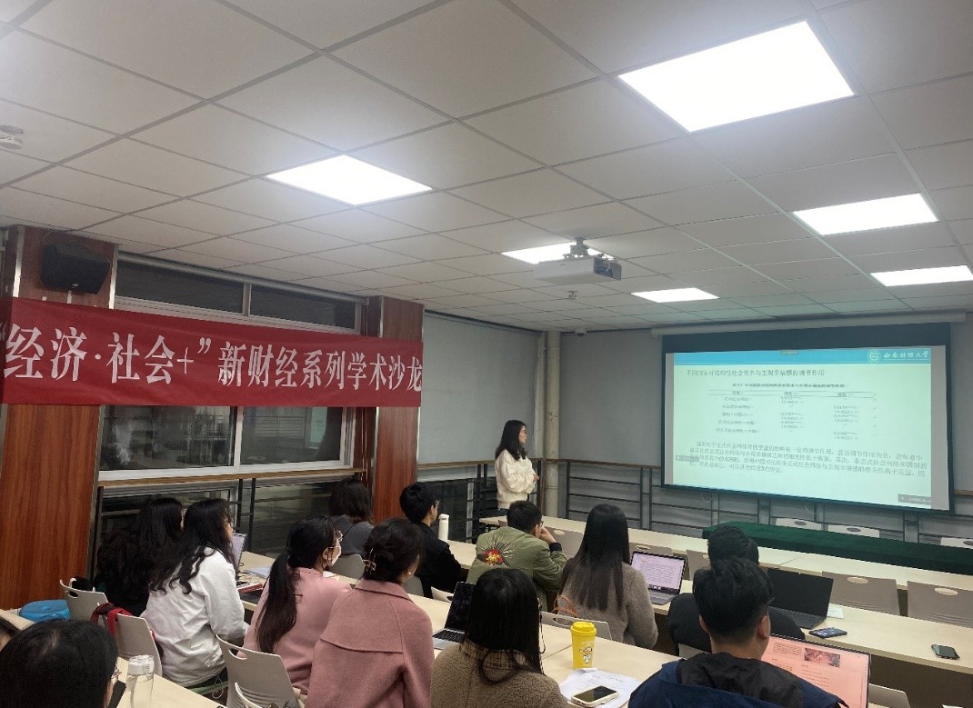 2023年3月23日晚,经济社会学所和教工第三党支部主办的“经济·社会+”新财经系列跨学科学术沙龙第一讲于通博楼A509成功开展。首场学术沙龙由该所所长和支部书记谭远发教授主持,2020级人口、资源与环境经济学专业博士生朱春霞和2020级社会经济学专业硕士生刘晓宁分别作汇报,天美传媒