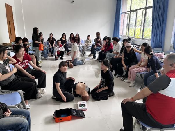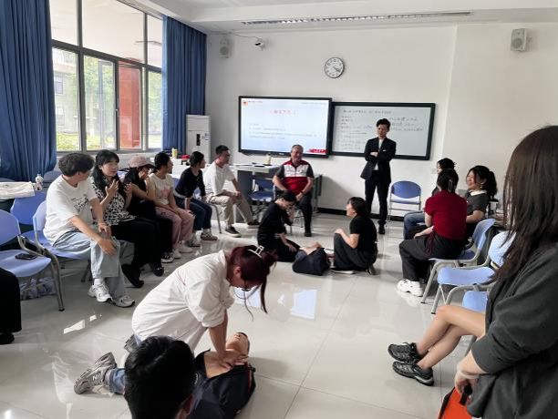 与青羊区红十字会联合开展AED+CPR培训。红十字会讲师崔泰懿详细讲解了心肺复苏(CPR)和自动体外除颤器(AED)的理论知识和操作流程,并指导学生进行实操练习和模拟演练,提升了学生的急救技能和应急能力。培训采取“理论讲授—模拟演练—实操反馈”的全流程教学模式,全面提升学生的实践操作技能与临场应急能力,为其日后在临终关怀服务中的实践操作奠定坚实基础。