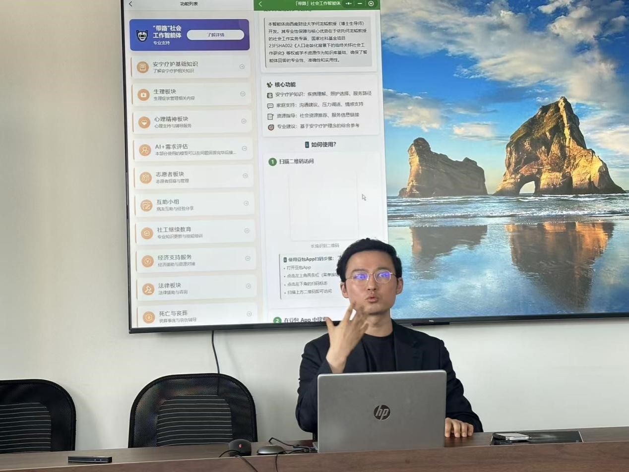 何龙韬教授主讲,围绕“带路”数智社会工作平台与智能体实操应用开展开专项培训。培训中,何龙韬详细演示了平台核心功能模块,深入浅出讲解智能体的搭建逻辑、操作流程与场景适配方法,重点指导教职工将平台工具与社会工作实务、学术研究相结合,切实解决数智化实践中的操作痛点,助力师生高效运用数智工具开展社会服务与课题研究。